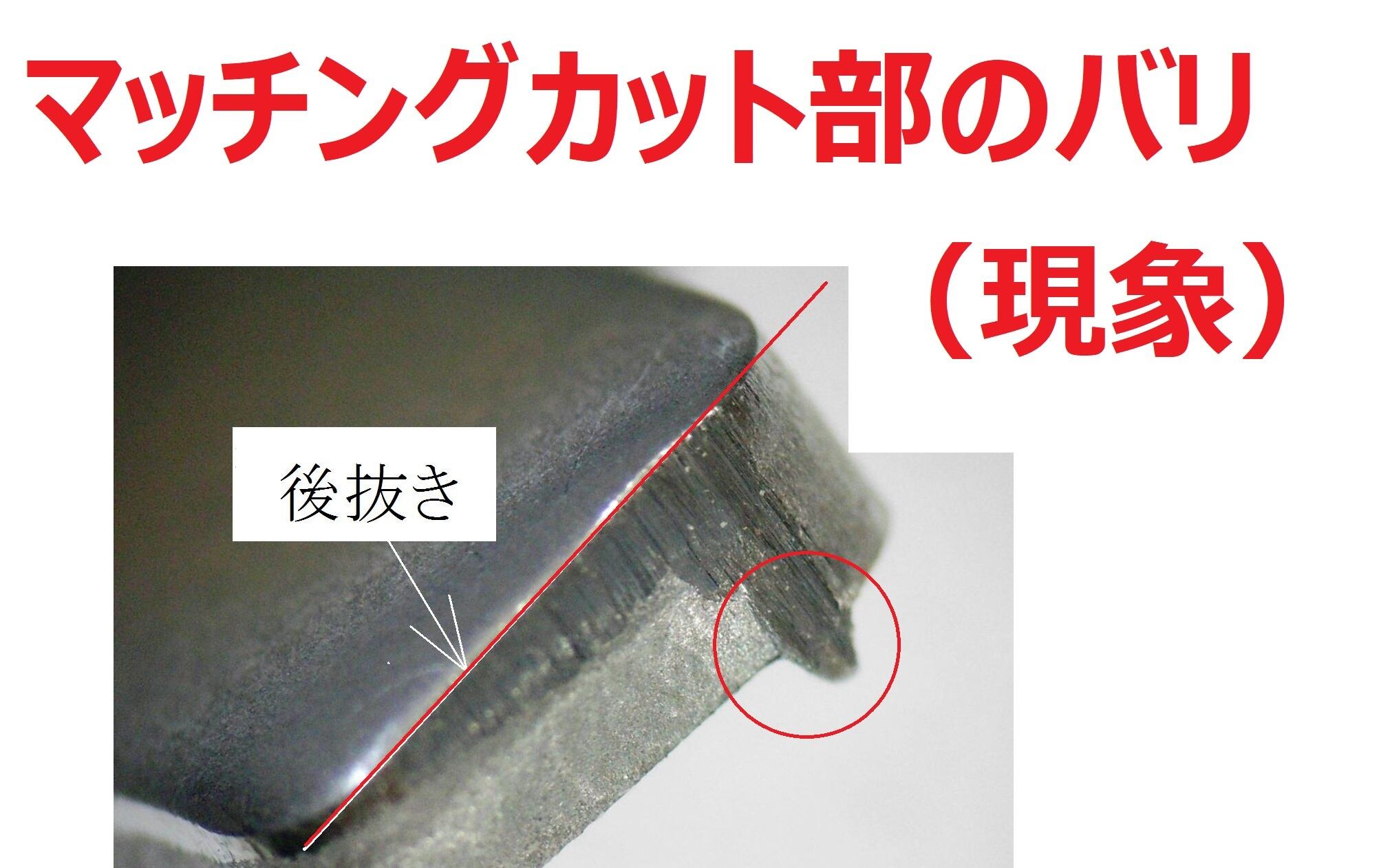 順送加工における打抜き加工の繋ぎ目であるマッチングの部分にはとても大きなバリが発生します。